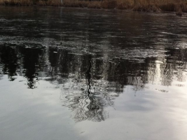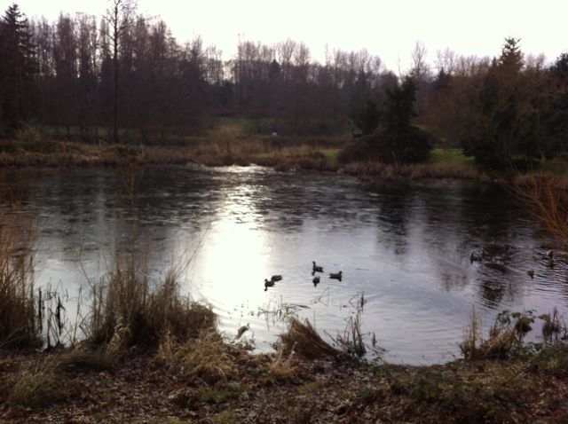 This year, I returned again on New Years Day.  It was overcast, and the pond in the park behind the beach was half frozen over.
